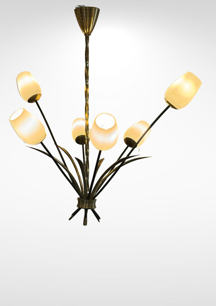 The chandelier has 6 tulip shaped opaline glass diffusers.