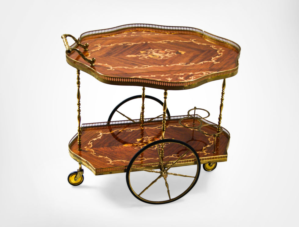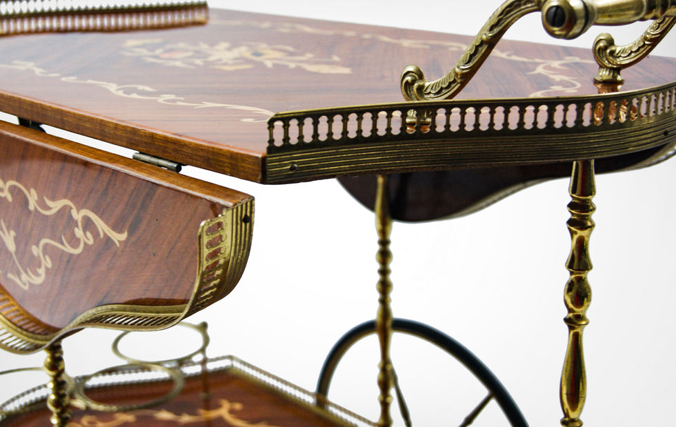 Two tiered trolley with the top section holding the drop leaves extensions and the bottom section with bottles caddy in brass.