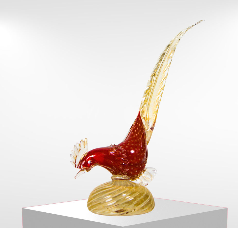 Elegant and tall glass Pheasant sculpture, in colour deep red with controlled bubbles and gold inclusion, all intricately submerged in a clear exterior.