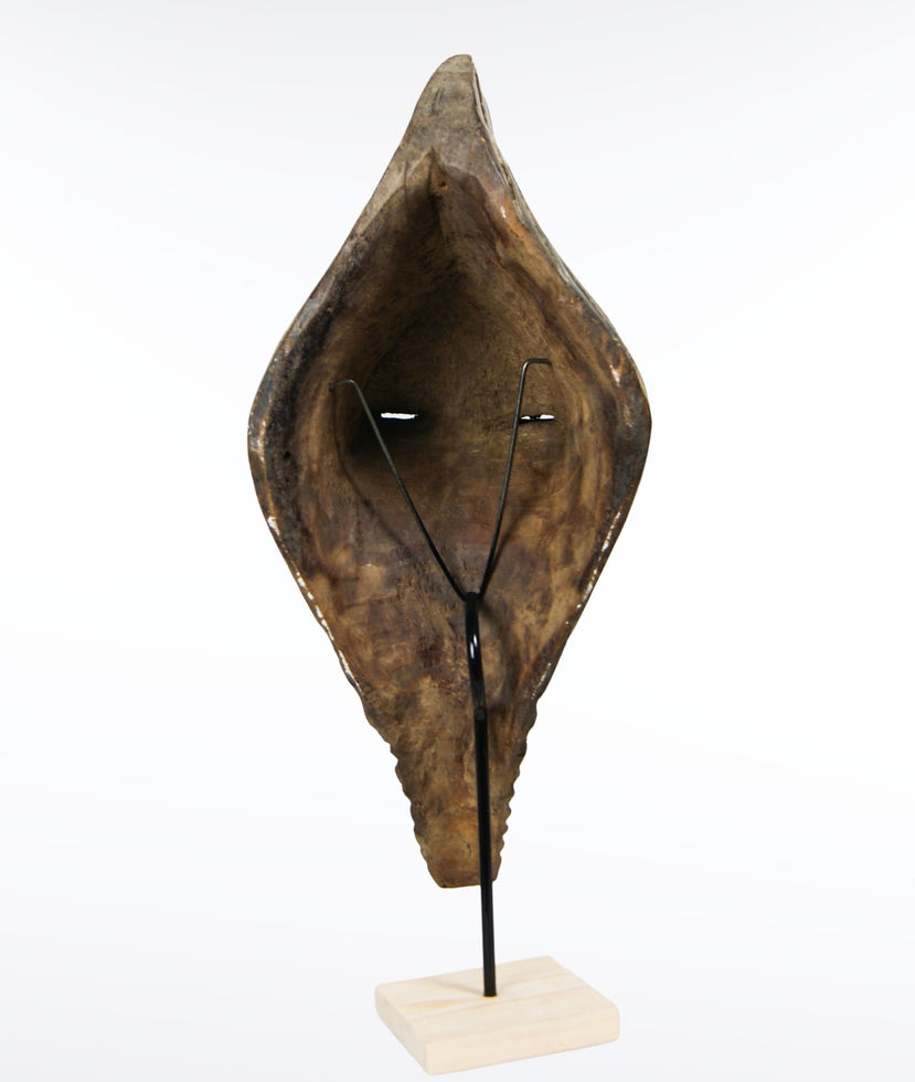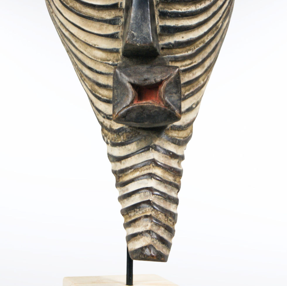 This mask is decorated with carved linear bands in alternating white colour and plain wood.