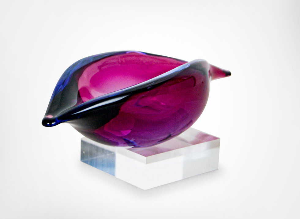 Thick walled pink and purple glass sculptural bowl in the form of a fish.