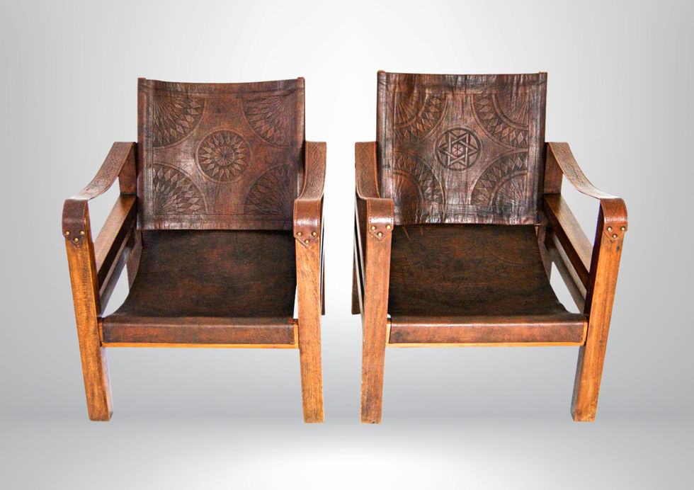 The armchairs have tilted backrests and leather arm straps with brass rivets.