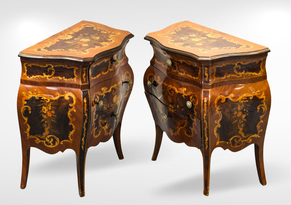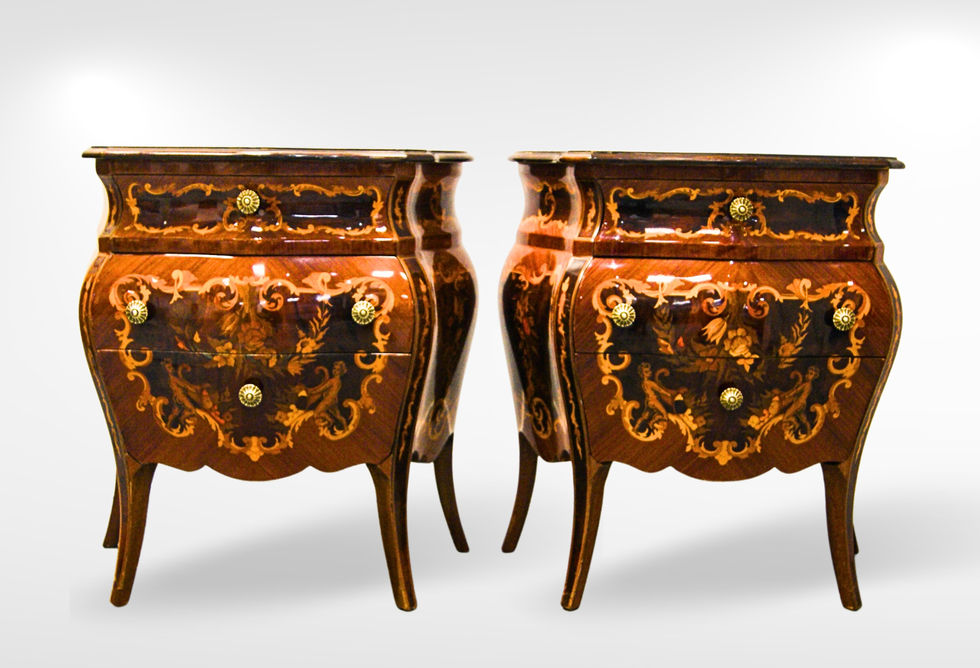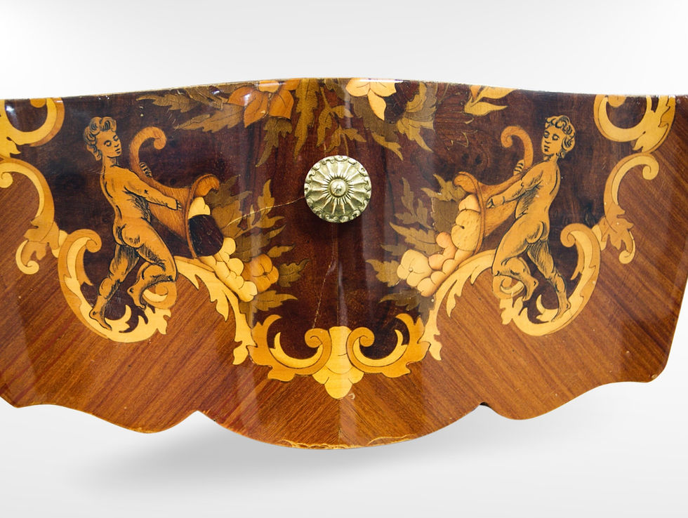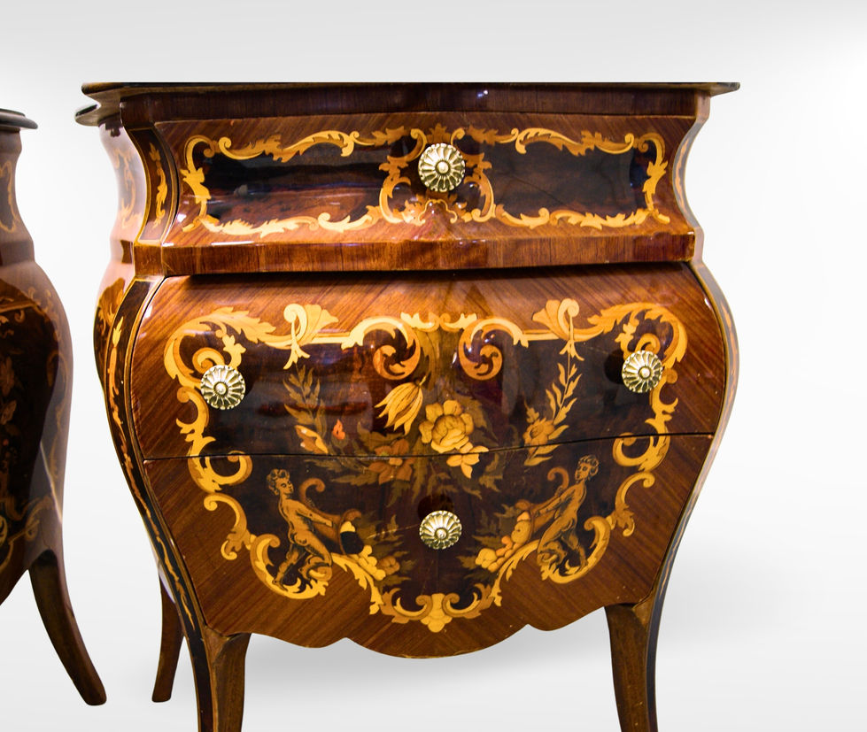 Regency Pair of 1950s Italian Inlaid Marquetry Bombe Commodes With Putti Angels