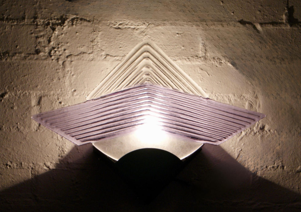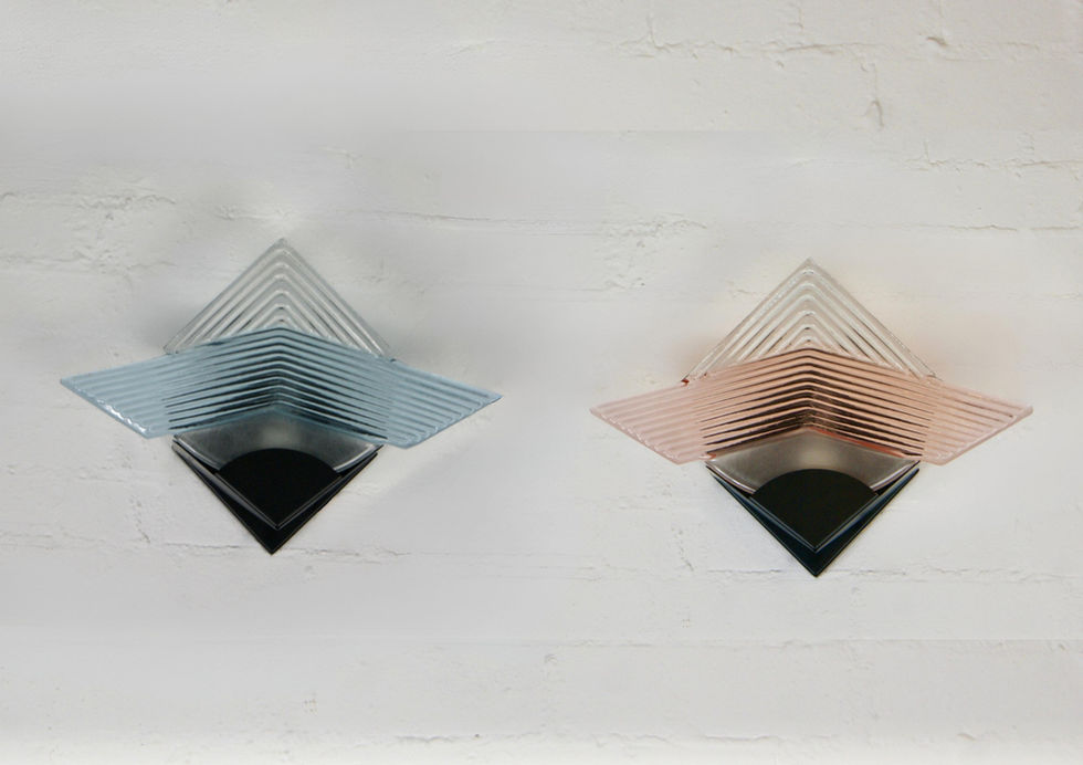 Exquisite rich warm glow delivered by thick slabs of frosted and coloured glass diffusers, one in delicate salmon pink colour and the other in sky blue.