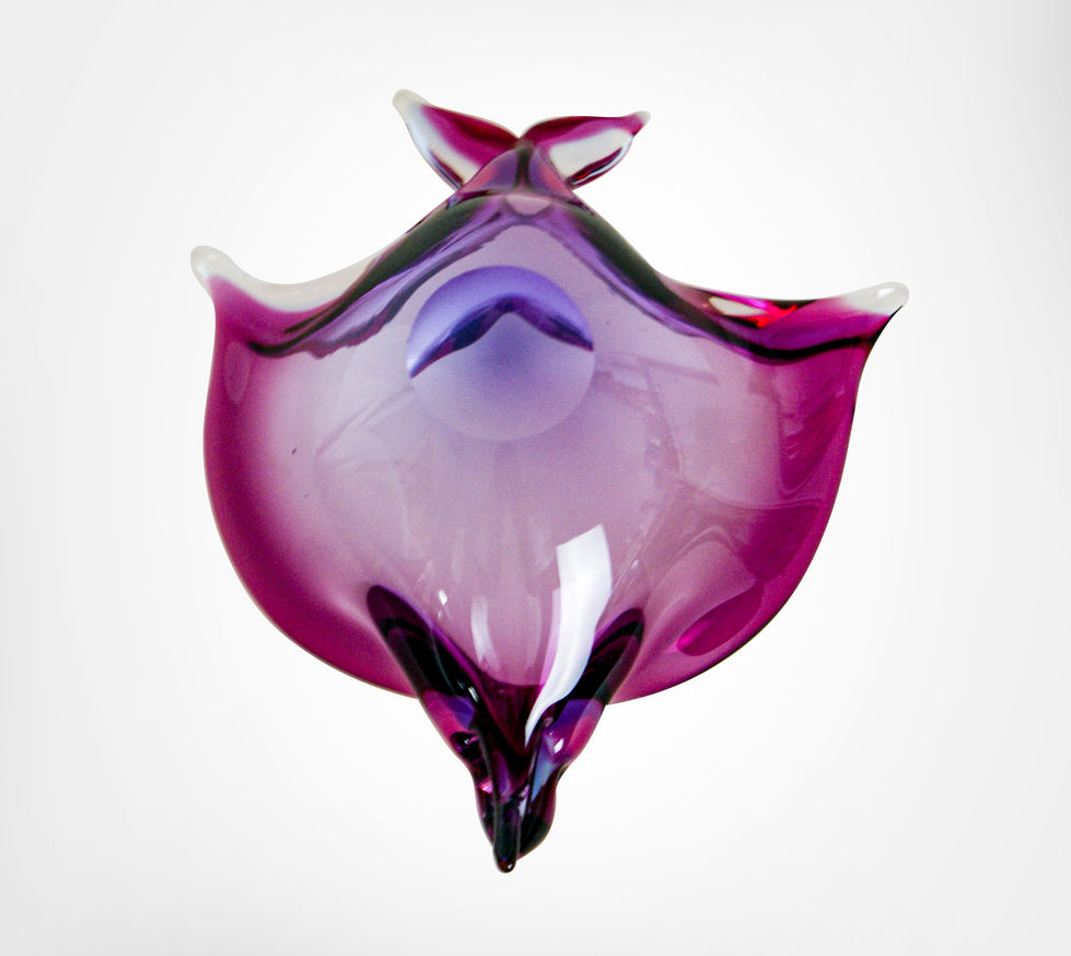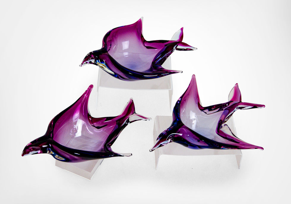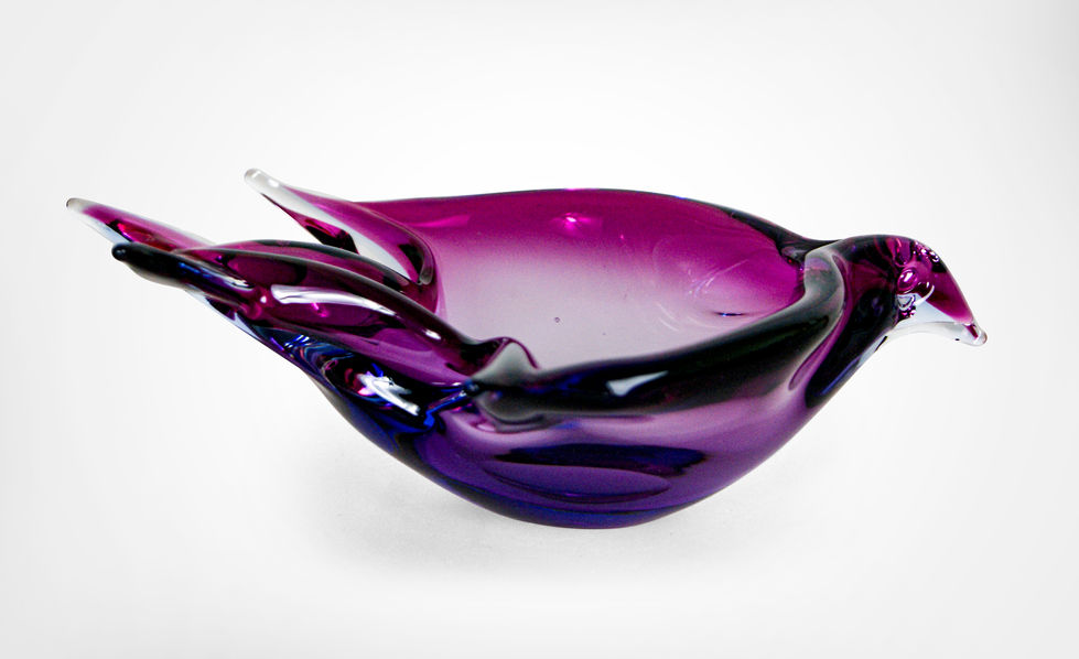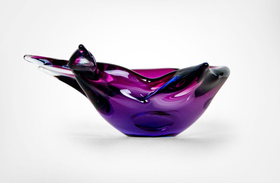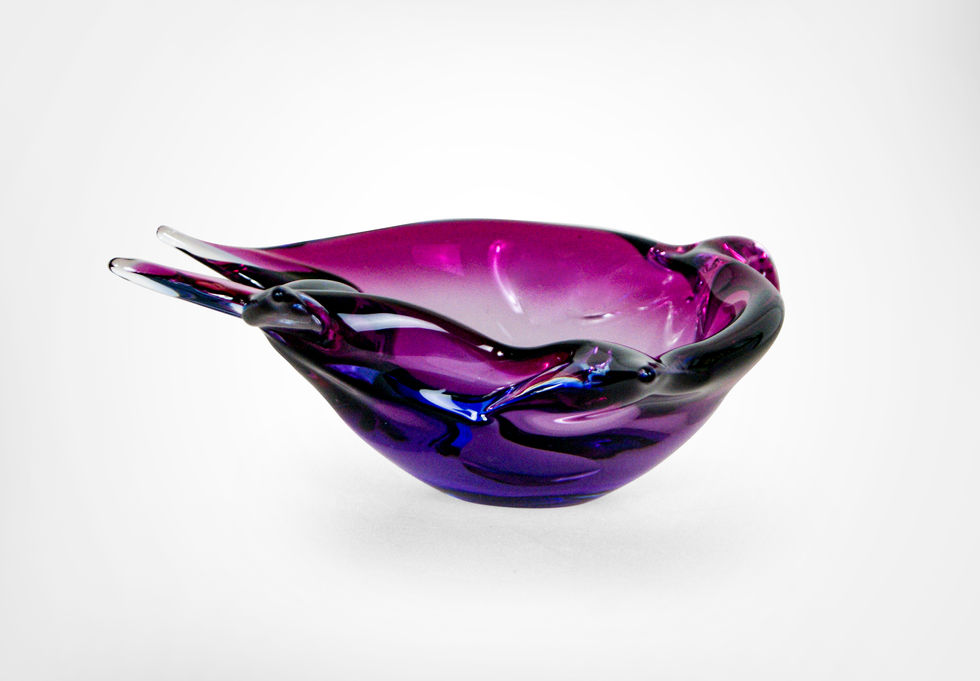 Thick walled pink and purple glass sculptural bowls in the form of birds mid flight.